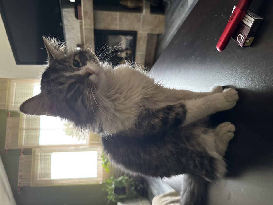 - "The image depicts an indoor scene in Lozen, Bulgaria, focused on a domestic cat seated on a dark, flat surface, likely a table" by FM-UWaef1, licensed under CC BY 4.0