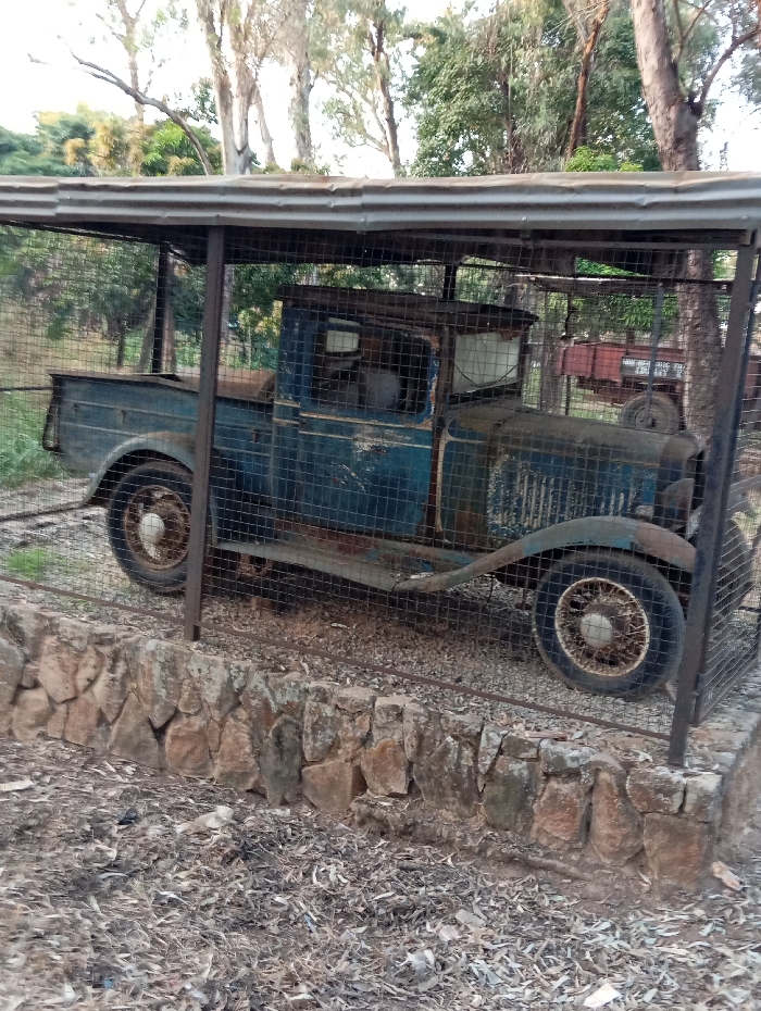 - "The image depicts an abandoned, heavily rusted vintage blue pickup truck, likely an early to mid-20th-century model, enclosed within a rudimentary outdoor display structure" by FM-IkfyG2, licensed under CC BY 4.0