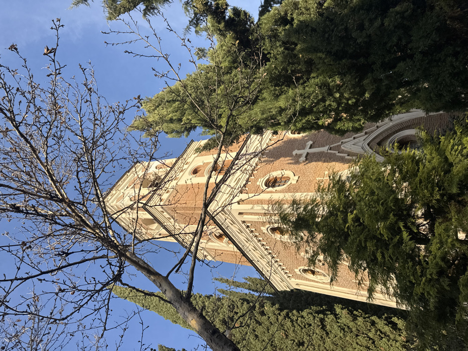 This image depicts the bell tower of the Church of St. Stephen and St. Nino, located in the city of Sighnaghi, Georgia. The bell tower, constructed primarily of red brick with cream-colored architectural trim, stands vertically against a clear blue sky. It features multiple levels, each with distinct decorative elements including cornices, vertical pilasters, and arched openings. The lower visible section of the tower exhibits arched windows and a prominent white Latin cross affixed to a pointed architectural element above an arched entrance, partially obscured by foliage. The upper levels of the bell tower reveal open arched belfry openings. Numerous trees surround the structure. In the foreground and partially framing the bell tower are bare deciduous tree branches, characteristic of winter. Taller, slender evergreen cypress trees (likely Italian cypress or similar coniferous species) flank the bell tower on both sides, extending vertically into the frame. A smaller evergreen shrub or tree is visible closer to the base of the tower in the mid-ground. Sunlight illuminates the scene, creating defined shadows on the tower's brickwork and highlighting the textures of the trees. No people are visible.