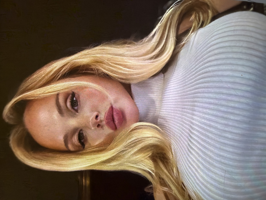 - "A close-up, frontal portrait depicts a Caucasian female subject with long, light blonde hair parted centrally and styled to frame her face" by FM-RZ2bK2, licensed under CC BY 4.0