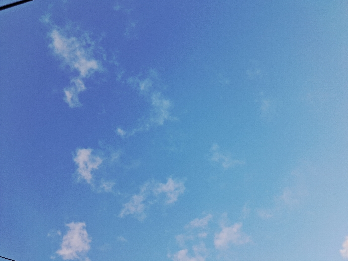 The image is a low-angle shot of a blue sky with scattered, puffy white clouds. The sky is a gradient, transitioning from a darker blue in the top left to a lighter blue towards the right. A faint power line is visible in the bottom left corner. The clouds are small and sparse, giving the overall impression of a clear, sunny day.