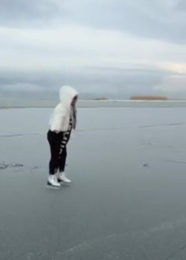 A person in a white hooded jacket, black leggings, and ice skates stands on a large frozen lake or body of water under a cloudy sky. They use a sign or board for support, then push off to ice skate across the frozen surface. The ice is cracked in many places. Another person can be seen in the distance on the ice.