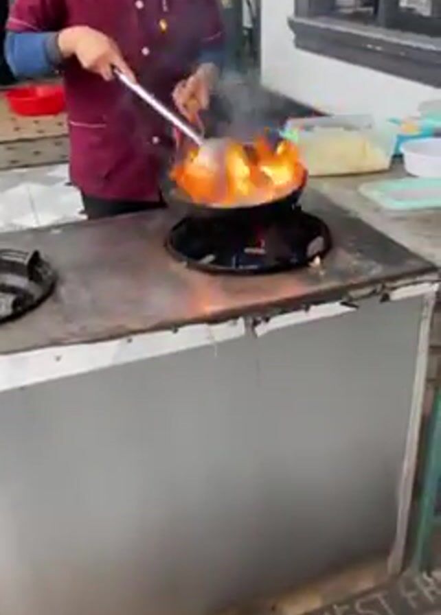 person cooking in a wok over a large burner. The person is wearing a maroon shirt and black pants. They are using a long metal spatula to stir the food. The wok is on a metal countertop that has two burners. The flames are reaching up above the wok, possibly due to the high heat and the addition of some type of liquid to the wok. There is a window visible in the background, and it appears the action is taking place outdoors. The ground is covered with geometric tile.