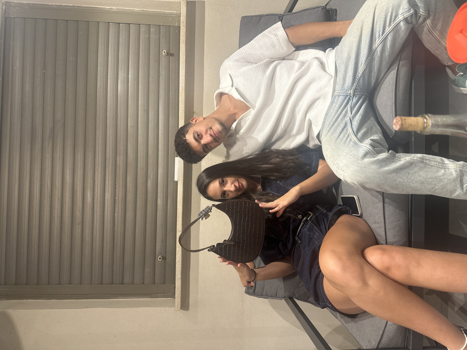 A female and a male are seated on a gray outdoor patio couch against a light-colored wall with a closed, gray, slatted rolling shutter. The exact location within Givat Shmuel, Israel, is not discernible from the image. The female, positioned on the left, has long dark hair and wears a dark denim playsuit. She is holding up a dark brown, crescent-shaped handbag with a crocodile texture pattern towards the camera. A white smartphone rests on the cushion beside her right thigh. Her legs are crossed, and she is looking forward with a slight smile. The male, on the right, has short dark curly hair and wears a white textured short-sleeved polo shirt and light blue jeans. He is leaning back slightly, looking forward with a smile. His left arm rests behind the female. In the lower right foreground, a glass bottle with a cork stopper is partially visible. The scene is illuminated, suggesting an indoor or nighttime outdoor setting.