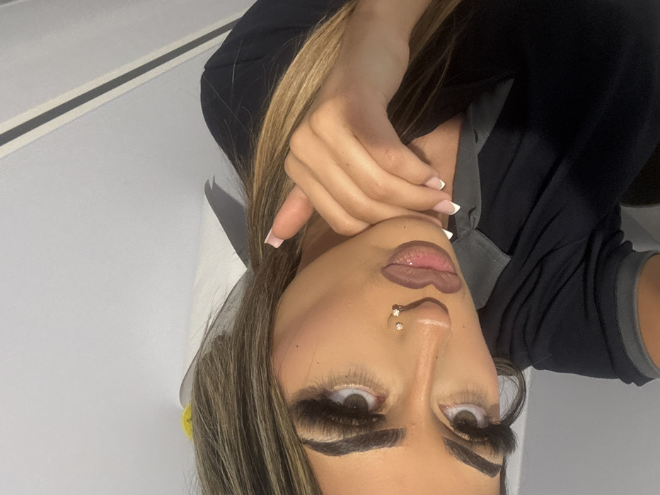 A woman tilts her head in the frame, showcasing striking makeup, including lush lashes, defined brows, glossy lips, and a nostril piercing. She has long, highlighted hair. Her manicured hand, adorned with a French tip design, lightly touches her face. She's wearing a dark-colored, collared top, possibly a uniform. The background features a bright wall with subtle horizontal stripes.