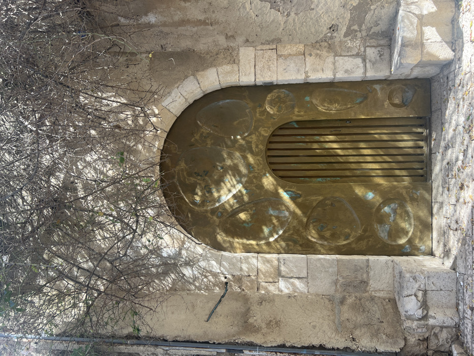 The image displays the entrance to the House of Quality in the Jewish Quarter of the Old City, Jerusalem, Israel. A large, arched bronze or heavily patinated copper door, approximately 2.8 meters in height, is the central feature. The door's surface exhibits a mottled green-brown verdigris patina and is adorned with numerous irregularly shaped, convex, organic protrusions. A smaller, integrated arched pedestrian gate, composed of vertical bronze slats, is positioned on the right side of the main door. The door is set within an archway constructed of light-colored, roughly cut stone blocks. To the left of the arch, the wall is a light-brown, textured stucco or plaster over stone, with sections of exposed stonework. A dark vertical pipe or conduit runs along the far-left edge of the frame, and a dark, bent metal rod protrudes horizontally from the wall just left of the arch. The wall section to the right of the arch similarly comprises stucco over stone. Overhead, dense, leafless, thorny branches cast intricate, dappled shadows across the upper wall and the top portion of the door. The ground directly in front of the door is paved with irregular, light-toned flagstones or cobblestones, upon which a few dry leaves are scattered. The scene is illuminated by strong, direct sunlight, creating sharp contrasts and distinct shadows. No people are visible.
