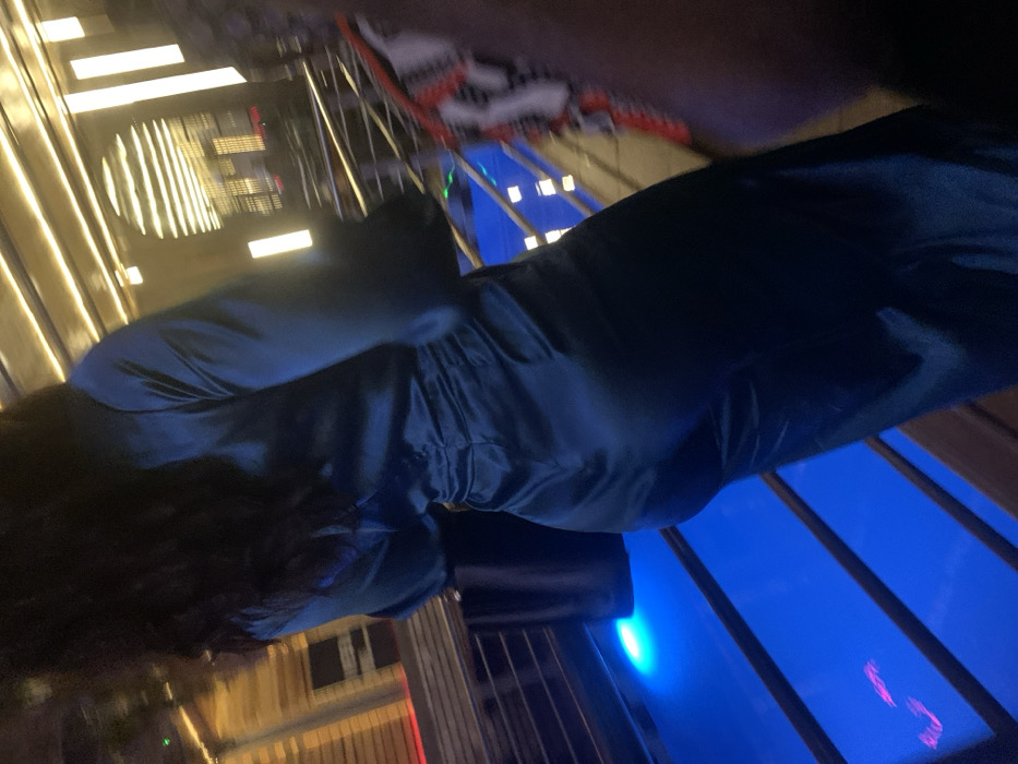 The photograph depicts a woman seated on a bench alongside a blue-lit area with parallel lines. She is wearing a shiny, dark blue shirt or jacket. Behind her, a building-like structure features parallel illuminated stripes. The image is slightly tilted, creating a dynamic perspective. A patterned cloth is draped at the top of the frame. The scene appears to be set in an urban, possibly entertainment-oriented environment.