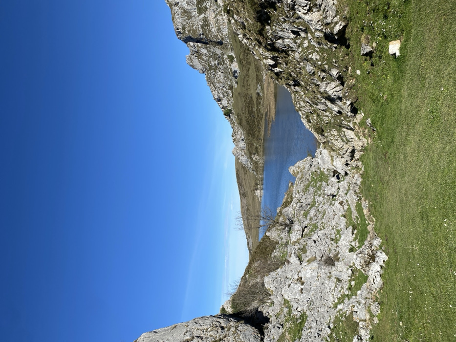 This image depicts a natural landscape in the mountainous region of Cangas de Onís, Spain, specifically showcasing a lake nestled within a valley. The scene is dominated by a clear, deep blue sky filling the top third of the frame. In the foreground, a vibrant green grassy slope extends from the bottom of the image, leading into rugged, light-grey limestone rock formations. These formations are visible across the lower midground, with a prominent, larger rock face anchoring the left side of the frame. Sparse patches of green vegetation and a few bare deciduous shrubs are interspersed among these rocks. The midground is occupied by a calm, dark blue lake, whose surface shows slight ripples and reflects the sky. The lake is partially enclosed by the surrounding terrain; a steep, rocky slope covered with green and brown vegetation rises from the right side of the image towards the water's edge. Beyond the lake, the landscape transitions into undulating hills, also covered in green and brown vegetation and scattered rock outcrops, extending into the background. No individuals, animals, or man-made structures are present within the frame. The lighting suggests natural daylight under clear weather conditions.