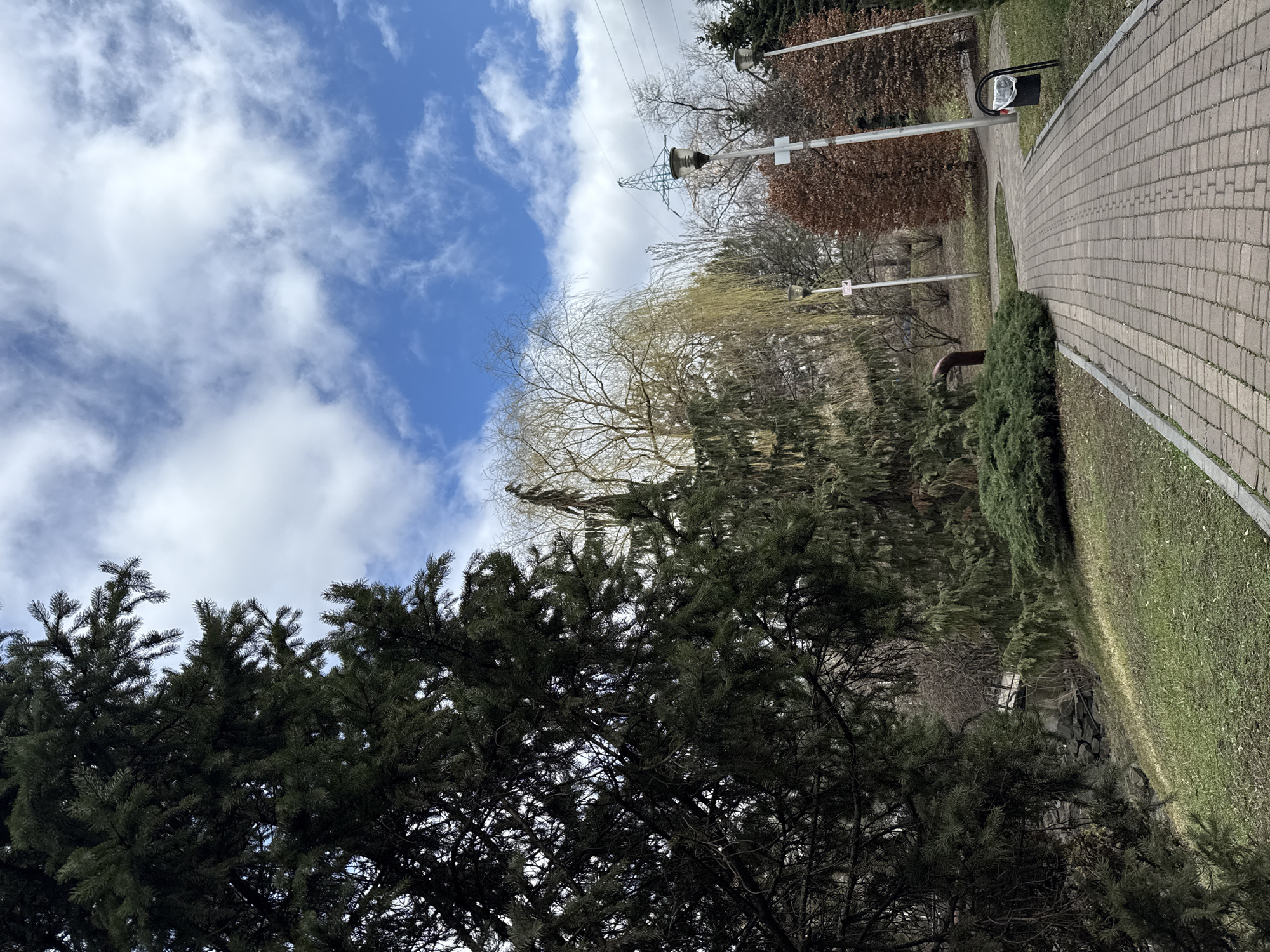 An outdoor, daytime image depicts a park scene in Donetsk, Ukraine, likely in the vicinity of the Park of Forged Figures or a similar urban green space. The sky occupies the upper portion, exhibiting a clear blue with scattered white cumulus clouds. A large, dark green coniferous tree dominates the left foreground, its dense branches partially obscuring the view. A light-colored paved pathway, constructed from rectangular pavers, extends from the bottom center towards the midground, curving gently to the right. A low, trimmed evergreen bush is situated to the left of the pathway in the midground. A black metal trash can with a white plastic liner is positioned on the right edge of the path in the foreground. To the left of the path, a grassy slope with varying shades of green and brown foliage is visible. In the midground and background, numerous trees are present, including bare deciduous trees, other coniferous trees, and a tree with light, drooping branches. Several light poles, each topped with a circular luminaire, are spaced along and near the pathway. A distinctive light blue, star-shaped electricity pylon, connected by overhead power lines, stands against the sky in the upper right background, characteristic of central Donetsk. No people or animals are present in the scene.