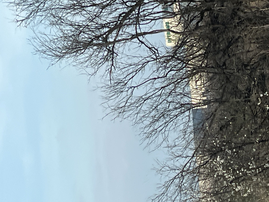 The image depicts an outdoor scene in the city of Tsaratsovo, Bulgaria, under a clear, light blue sky. The foreground and midground are dominated by a dense arrangement of dark, mostly bare tree branches, suggesting a late winter or early spring season. In the lower-left portion, a section of a tree displays numerous small, white blossoms or buds. Through and above the tree line in the background, several man-made structures are visible. A prominent white building on the right features green lettering, partially discernible as "INTRAMA." Other less distinct industrial or commercial buildings are present further to the left within the background. No individuals or discernible actions are present in the scene.