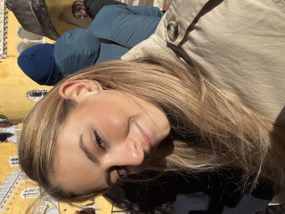A young Caucasian female is depicted in a close-up, outdoors on a sunny day at the Pena Palace in Sintra (Santa Maria e São Miguel, São Martinho e São Pedro de Penaferrim), Portugal