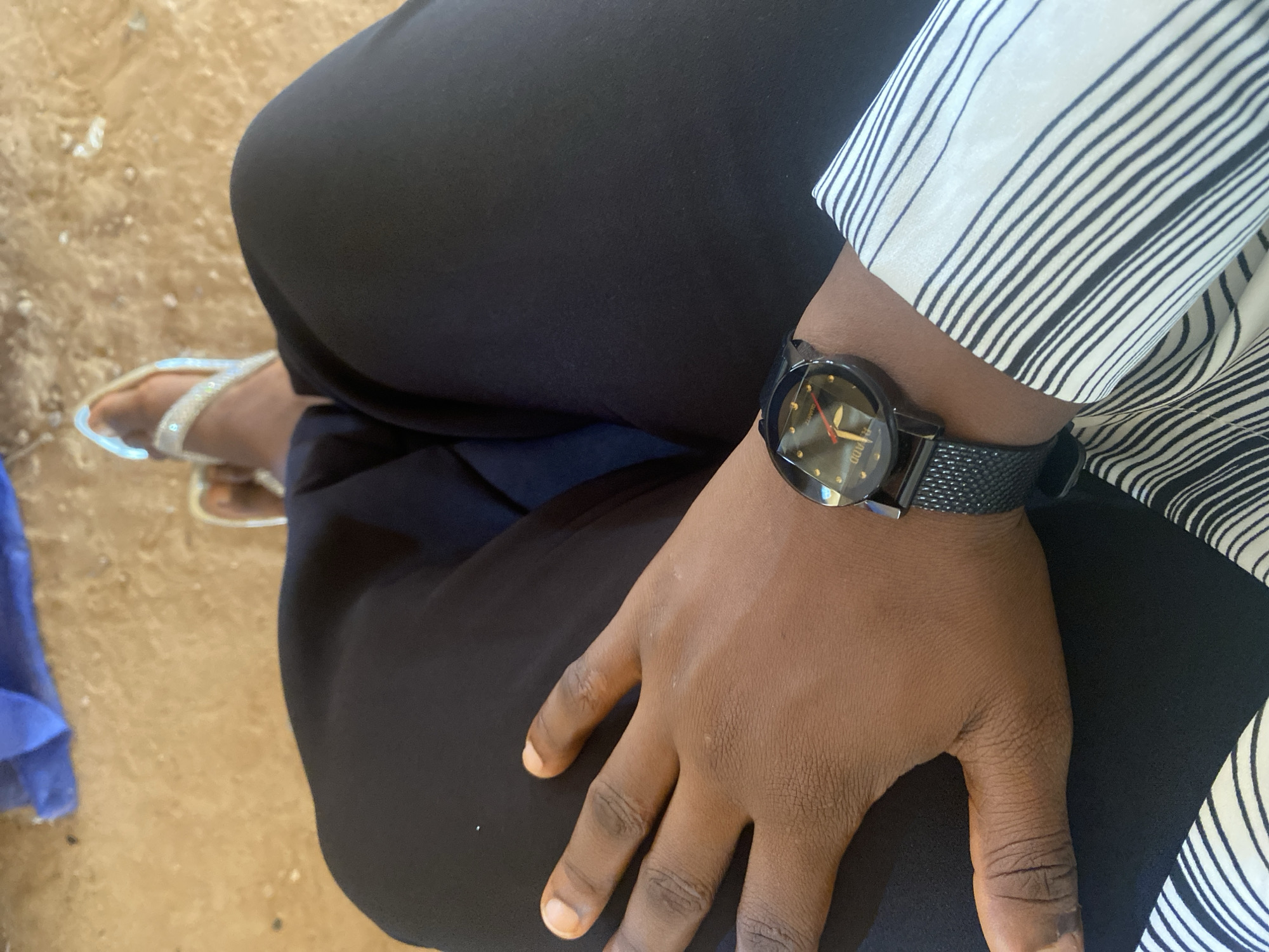 A person is seated with their legs crossed, wearing black pants, a striped blouse, and silver sandals. A black wristwatch is on their left wrist. The location is not discernible within the city of Nsukka, Nigeria, based solely on the provided image. The setting is an indoor or outdoor area with a light-colored, possibly unpaved, surface.