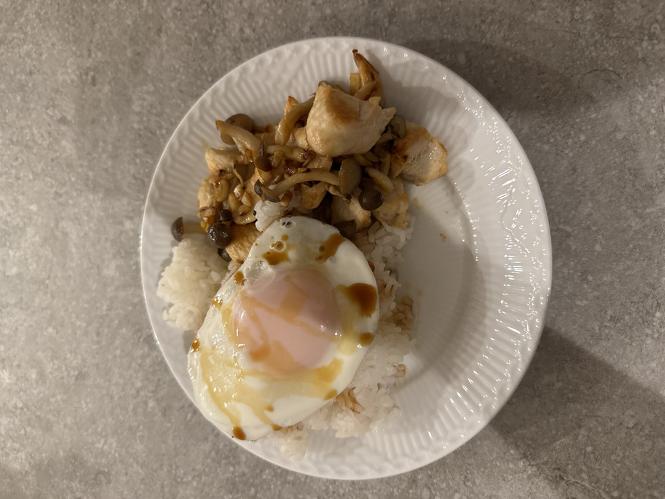 A white plate holds a serving of rice, topped with a fried egg drizzled with sauce. Beside the egg and rice is a mixture of sautéed chicken and mushrooms, also glazed with a savory sauce. The plate has a textured, ridged pattern around its edge. The food is centrally positioned on the plate, which itself is set on a gray surface.