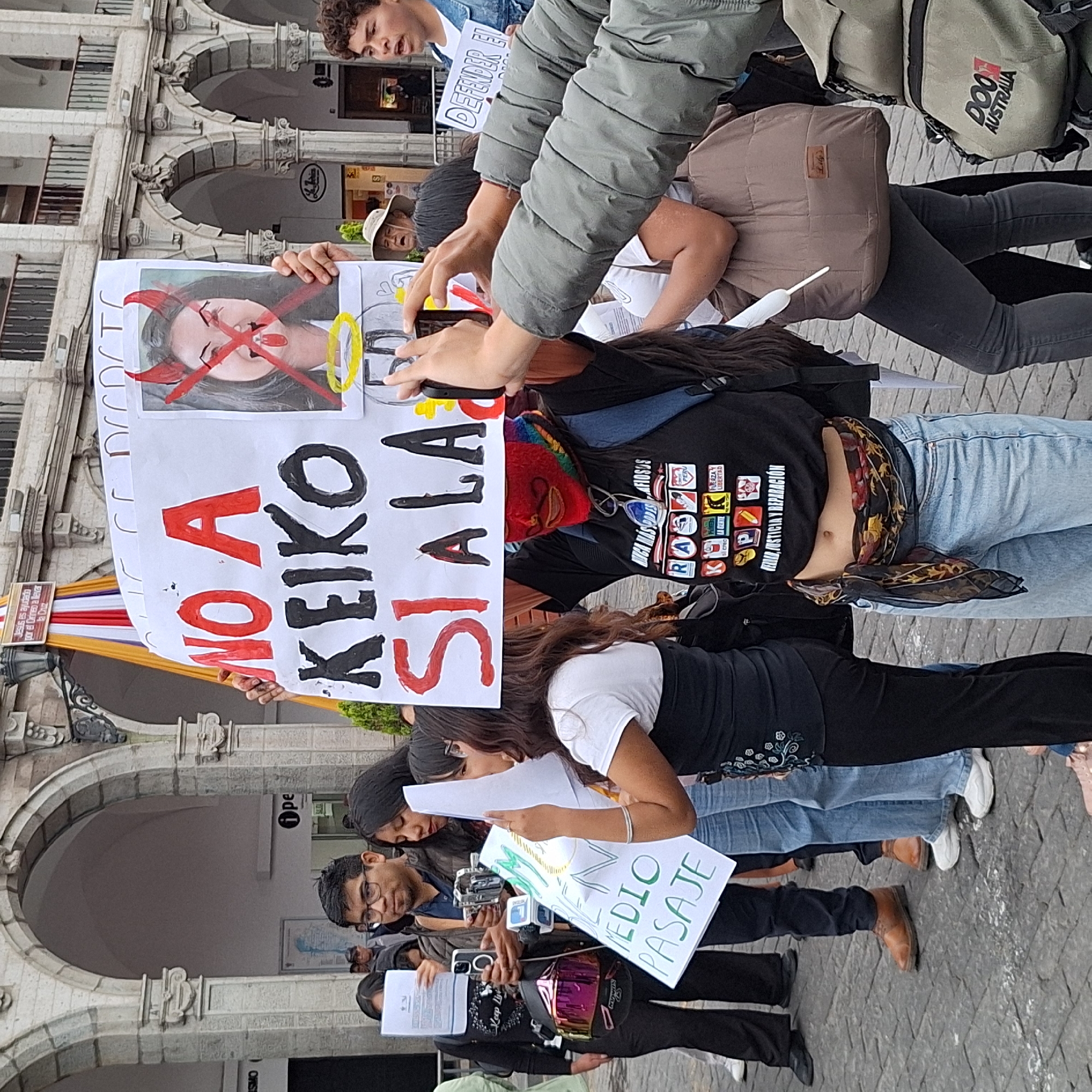 The image displays an outdoor protest or public gathering in the Plaza de Armas, Arequipa, Peru