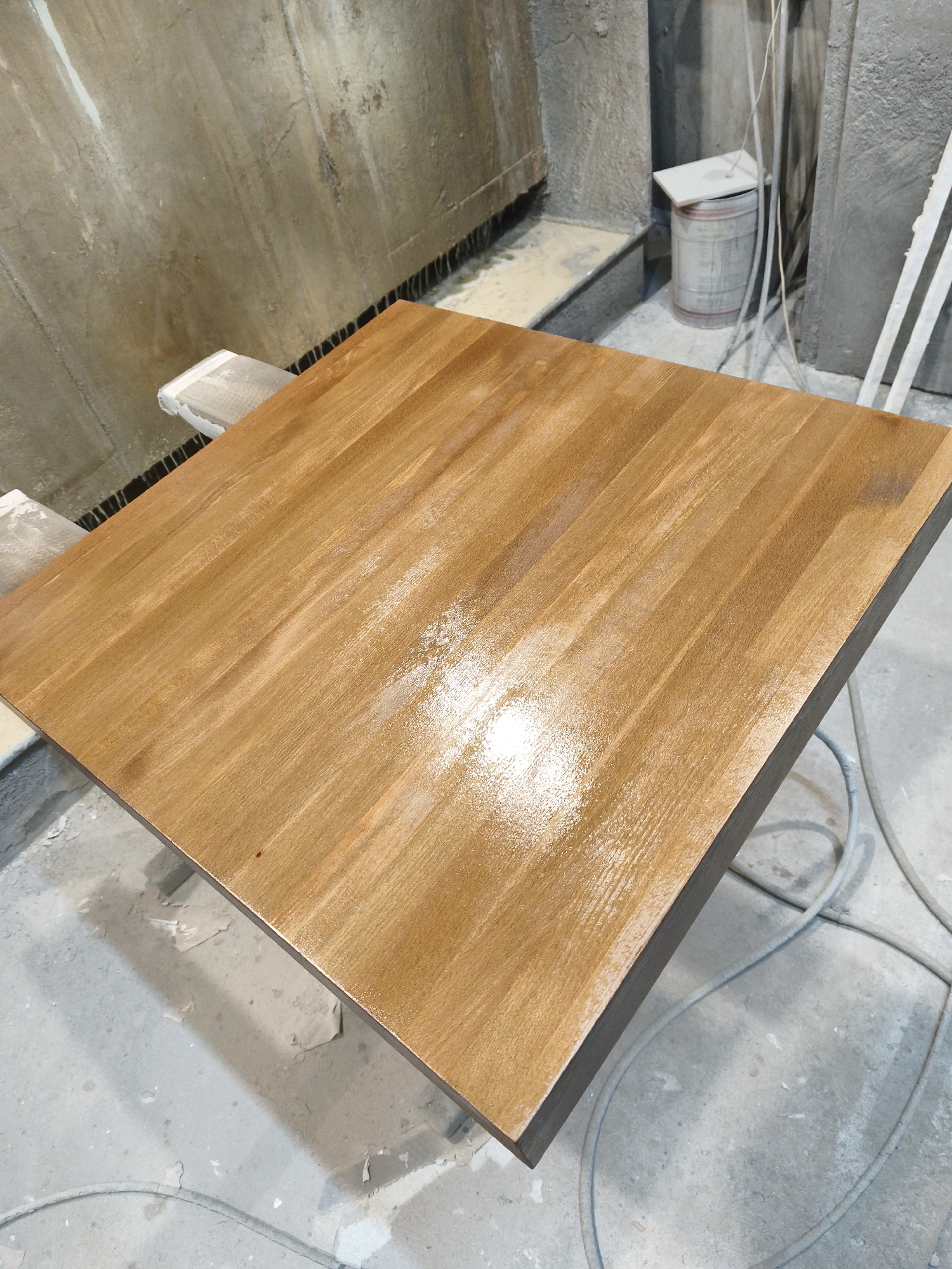 The image displays a square wooden tabletop undergoing a finishing process within an industrial workshop in Negorci, North Macedonia. The tabletop, positioned centrally, exhibits a reddish-brown, medium-toned wood grain, coated with a wet, glossy sealant that reflects a bright light source on its surface. It rests on two light-colored, rectangular support blocks positioned at its front and rear edges. The surrounding environment consists of unfinished grey concrete walls, one with vertical streaks and a dark base line, and another featuring a recessed section. The concrete floor is mottled with various light and dark patches, covered by coiled grey cables or hoses. In the background, a white metal barrel with faint red banding is visible, topped by a white rectangular lid, situated against a concrete structure. No individuals are present in the scene.