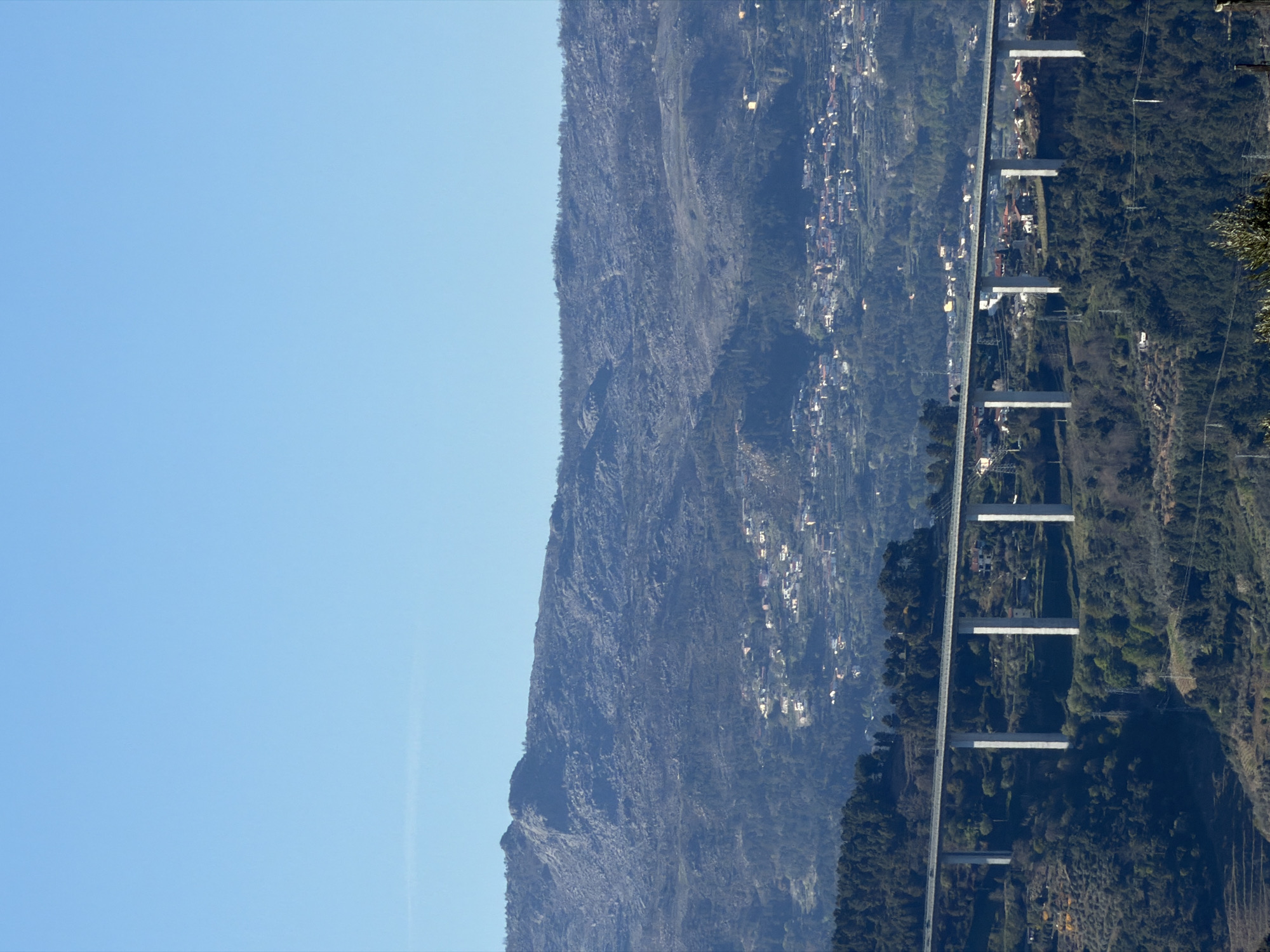 The image presents a view of Vila Real, Portugal, featuring a prominent mountain range on the left side of the frame with a rugged, rocky surface, and a scattering of buildings along its slope. To the right, a tall bridge spans the landscape, supported by white concrete pillars. Lush vegetation and more buildings are interspersed across the terrain below the bridge. A clear blue sky occupies a significant portion of the left side of the image. The photograph is oriented vertically.