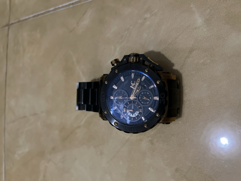 - "A black and gold-tone Alexandre Christie chronograph wristwatch is positioned centrally on a light brown tiled surface" by FM-ptDWd2, licensed under CC BY 4.0