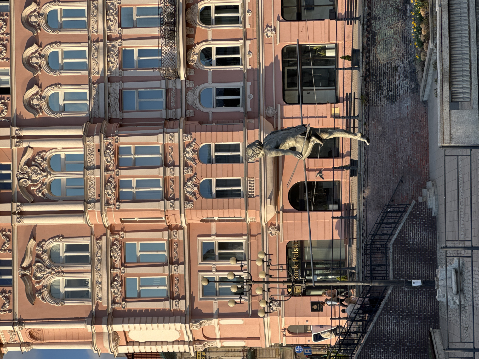 This is an eye-level, vertically-oriented photograph depicting a street scene in Bydgoszcz, Poland, with a focus on an ornate, pinkish-tan building. The building features multiple rows of windows, some with decorative arched tops and intricate embellishments around them. A statue of a naked male figure hangs from wires in front of the building. The building appears to be a bank with a sign that includes the phrase "Bank Polski". A lamppost with multiple spherical lights is in front of the building, partly obstructing the view of the bank's entrance. Several people are gathered around the base of the lamppost. The ground is composed of brick and stone, with stairs leading up along one side. A narrow strip of greenery, including flowers, runs along the edge of the building on the right. The sky is not visible, implying a close-up perspective of the lower portion of the building and street.