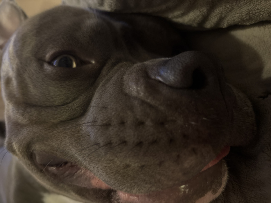 A close-up shot captures the face of a grey pitbull-type dog. The dog's left eye is visible, gazing towards the viewer, while its dark nose dominates the frame. Whiskers dot the dog's muzzle. Its mouth is slightly open, revealing a pink tongue. The dog appears to be lying down, and a portion of what seems to be a blanket or bedding is visible in the background.