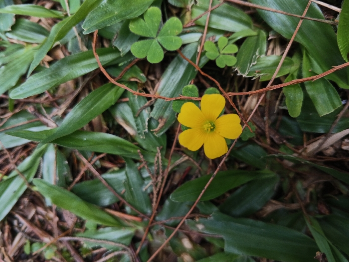 A close-up view captures a bright yellow flower with five petals, nestled among vibrant green foliage. The surrounding greenery includes broad, pointed leaves and clover-shaped leaves. Brown pine needles and thin, wiry stems weave through the scene, adding texture to the ground cover. The composition creates a natural, close-to-the-earth perspective of a small patch of vegetation.