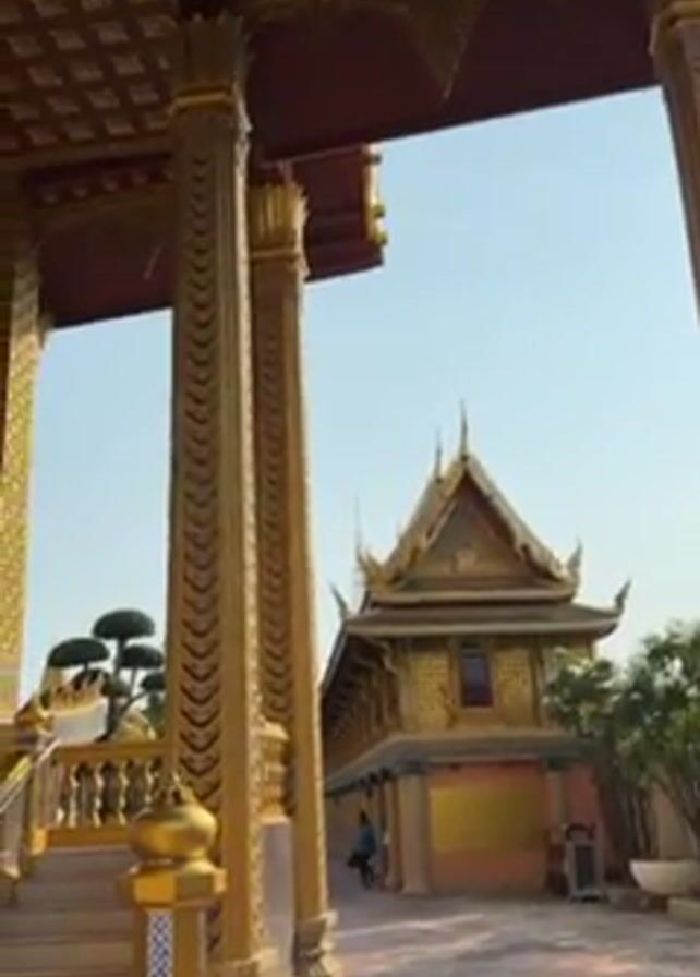 building with traditional Thai architecture, featuring gold-colored structures. The building has intricate carvings, columns, and a multi-tiered roof. A walkway made of red and tan stone leads to the building. A few people can be seen walking along the walkway. The sky is clear and blue.