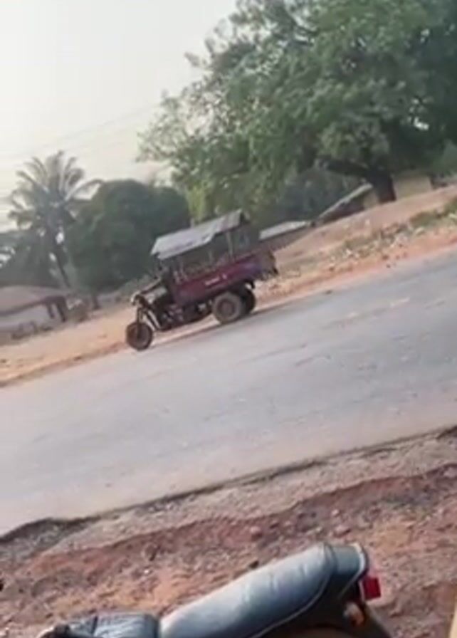 three-wheeled motorcycle-like vehicle with a flatbed driving on an asphalt road. A person is driving the vehicle, which has a red frame, open-air cab, and cargo on the flatbed, including what appears to be styrofoam containers. The environment includes buildings with corrugated metal roofs, trees, dirt, and what appears to be another motorcycle parked in the foreground. The sky is hazy. The vehicle drives away from the camera.
