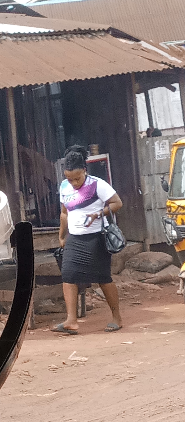 The scene depicts an unpaved street in Onitsha, Nigeria, under daylight conditions. A dark-skinned adult female, positioned centrally, walks from left to right with her head tilted downwards, holding a white mobile phone in her right hand. She wears a white t-shirt featuring purple, white, and light blue geometric patterns across the chest, a black knee-length ribbed skirt, and light brown slip-on sandals. A black handbag is carried on her left arm. The ground is composed of reddish-brown dirt with scattered light-colored debris. In the background, multiple structures with rusted corrugated metal roofs are visible, presenting dark, possibly weathered or charred, surfaces. To the right of the subject, a yellow auto-rickshaw (Keke Napep) is partially visible, with stacked sacks or bags behind it. A dark, vertical object partially obscures the lower-left foreground.