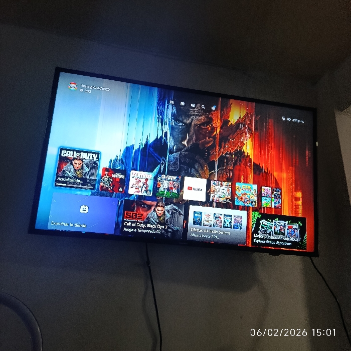 A flat screen television displays the PlayStation home screen. "Call of Duty: Black Ops 7" is prominent, with an update loading. Other game icons and the YouTube app are visible. The background features a dramatic image with a masked soldier. The date "06/02/2026 15:01" is visible in the lower right corner. Menu options like "Examine the store" and promotional offers are present on the screen.