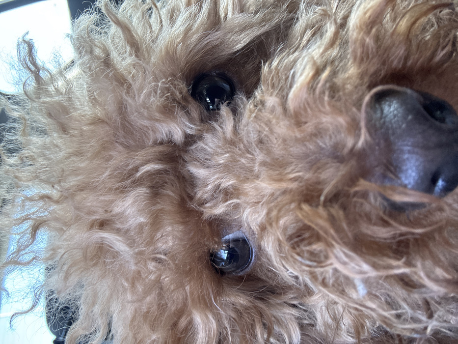- "The image displays a close-up, head-on view of a dog with dense, curly, reddish-brown fur, consistent with a poodle or goldendoodle breed" by FM-r2ed32, licensed under CC BY 4.0