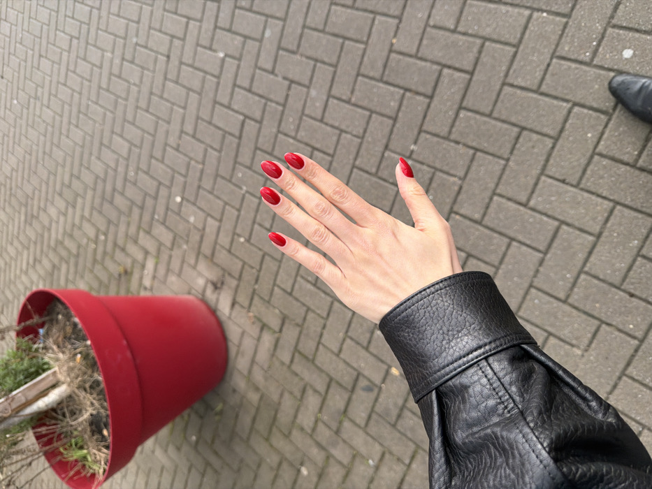 The scene is located in the city of Unknown, Unknown. A light-skinned left human hand is centered, extended forward, displaying five fingernails painted with glossy red polish. The nails appear oval-shaped. The hand emerges from the cuff of a black, textured leather jacket sleeve. The environment consists of an outdoor paved area, featuring grey rectangular interlocking pavers laid in a herringbone pattern. In the upper left background, a large, conical red planter containing a sparse, dormant plant with visible soil and minor debris is present. The toe of a dark-colored shoe is partially visible in the lower right corner of the frame.