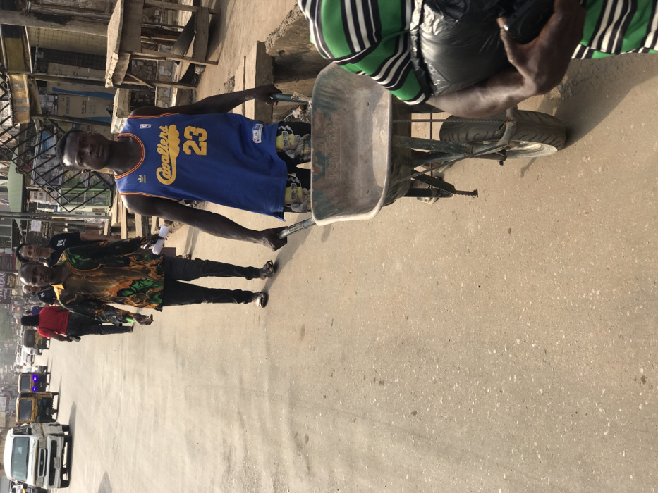 This image depicts a street scene in Umuokpu, Nigeria, under bright daylight. In the immediate foreground, partially visible on the right, is a person wearing a green and white horizontal striped shirt, holding a black, wrapped object. The central figure is a dark-skinned male, facing forward, wearing a blue Adidas "Cavaliers 23" basketball jersey and black shorts with yellow cartoon character graphics. He is pushing an empty, well-used metal wheelbarrow on the paved road surface. Directly behind him, another dark-skinned male walks, wearing a long-sleeved shirt with a green, orange, and black abstract pattern, dark trousers, and sandals, holding a rolled-up white paper in his left hand. Further down the street, several other individuals are walking, including a person in a red shirt. The road is paved with a light-colored material, showing some dirt and wear. To the right, an elevated, uneven sidewalk or ground area with a narrow drainage channel separates the road from market stalls or informal structures made of wood and metal. In the background, a line of buildings, some with corrugated roofs and visible signage, borders the street. Multiple vehicles, including a white van and yellow auto-rickshaws (kekes), are present on the road in the distance, indicating traffic.