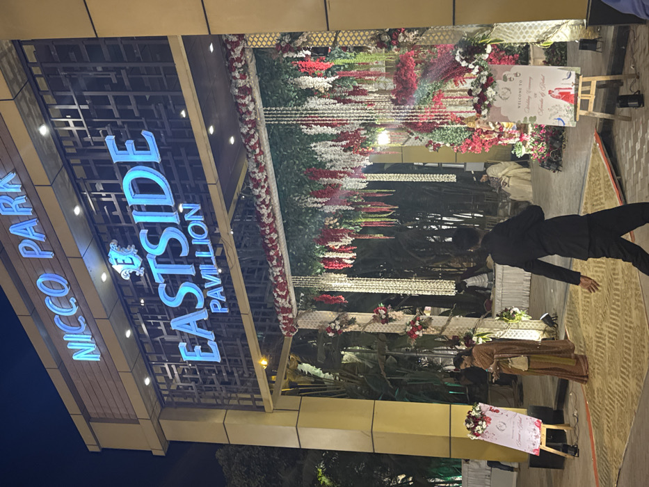 entrance of Nicco Park Eastside Pavilion decorated with cascading red and white flowers. A welcome sign is propped on an easel. Two people stand nearby, one in a brown outfit and another in a dark suit. The scene is captured at night with the building's illuminated signage prominently displayed.