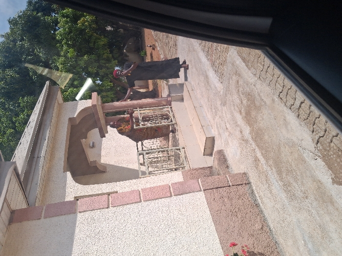 The image depicts an outdoor scene in Wukari, Nigeria, captured from inside a vehicle. The primary subject is a residential building with a light beige, textured facade featuring a lower band of light brown/pinkish color and vertical decorative strips. A small porch with a light-colored roof overhang and an arched entrance is visible. The porch is equipped with a low, decorative metal railing. Two individuals are present. On the porch, a person, likely female, with dark skin and wearing a patterned brown and orange garment, leans forward with her forearms resting on the railing. Off the porch, a second person, likely male, with dark skin and wearing a long dark robe and a red cap, stands barefoot on the light-colored paved ground. This individual holds a small dark object, possibly a mobile phone, to their right ear/mouth, suggesting they are engaged in a call or conversation. Their left hand rests on a porch pillar. The immediate ground in front of the house is paved with a light-colored material, showing some dirt or sand accumulation. To the right, cracked interlocking paving stones are visible. A low concrete structure or bench runs along the side of the paved area. Large green trees are present in the background under a bright sky, indicating daytime. Reflections from the vehicle's window are visible across the image.