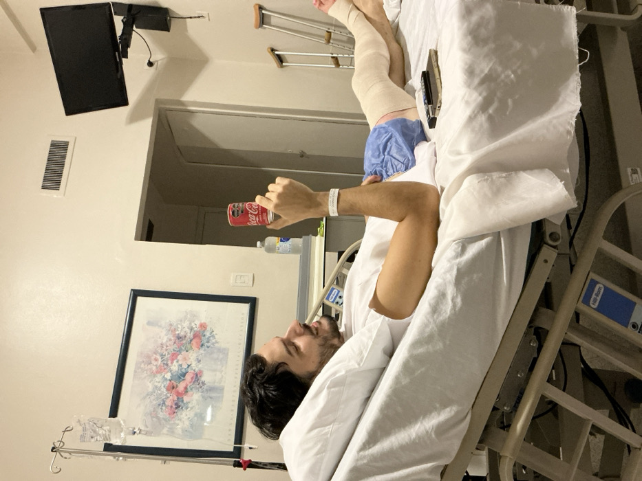 A man lies in a hospital bed, with one leg wrapped in bandages and supported by a blue surgical cap