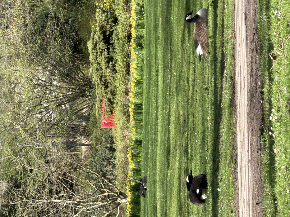 This image depicts a sunny park scene in Düsseldorf, Germany. The foreground features a strip of green grass and a dirt path running horizontally across the lower portion of the frame. On the grass, three geese are observed resting. In the lower-right quadrant, a Canada goose (Branta canadensis) with brown-grey body plumage, a black neck, and a white chin strap is lying down, facing right. In the lower-left quadrant, another goose, predominantly black with white markings on its head and underside, is also lying down, facing left. A third, dark-plumaged goose is resting further back on the grass in the mid-left area. Beyond the immediate lawn, a prominent band of bright yellow daffodils stretches across the middle ground. Behind this floral display, various green shrubs and trees, some with emerging spring leaves, form a dense background. A distinct red park bench is partially visible within the green foliage in the upper-middle ground, positioned behind the daffodil bed. The scene is illuminated by bright sunlight, casting shadows on the grass and indicating clear weather conditions.