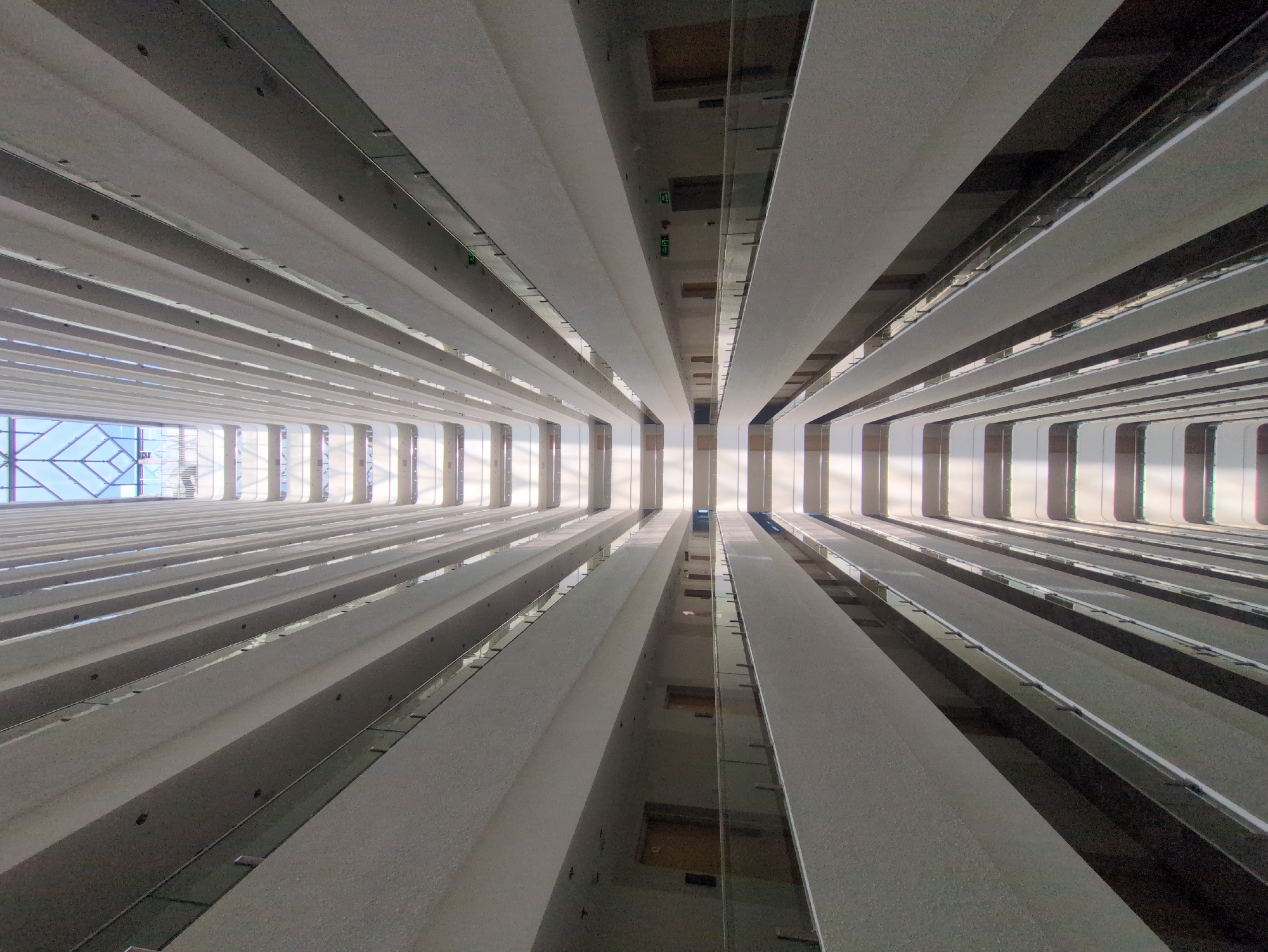 n upward-looking view inside a high-rise building in Quy Nhon Ward, Vietnam. The architecture features repeating parallel elements that extend toward the ceiling. The light source comes from above, possibly through a skylight, illuminating the interior space. The building's structure consists of alternating bands of solid, flat surfaces and open areas, which seem to be the spaces between floors. The overall color palette is predominantly gray and white with some color toward the opening.