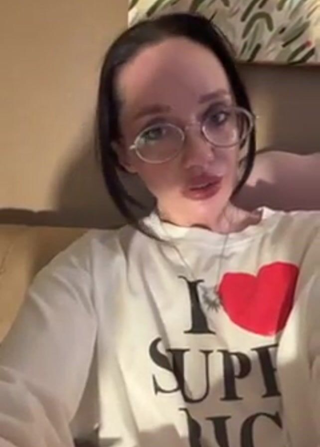 A woman wearing glasses and a white long-sleeved shirt with a red heart and the words "I heart SUPER RICH" on it is seated on a brown couch