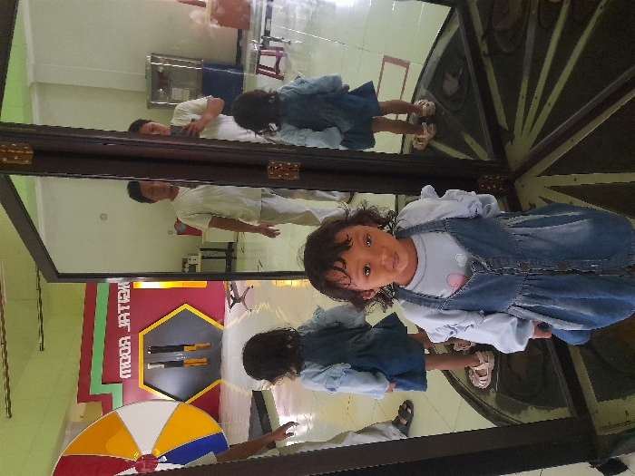 scene inside a building in Kecamatan Buduran, Indonesia, located at the coordinates -7.434 latitude and 112.72 longitude. There are three children, two of whom are reflected in a large, multi-faceted mirror made of several panels. The mirror is angled and shows a variety of perspectives. One of the children, a young girl with long dark hair, is standing in front of the mirror, wearing a light blue denim jumper dress over a pale pink long-sleeved shirt. She appears to be looking at the reflection of another girl, wearing a similar dress but with dark blue sleeves, standing in front of the mirror. The third child, a boy, is reflected in the mirror, wearing a white shirt and blue pants. The boy is facing the other girl in the mirror. The background of the image is a room with green walls and a colorful spinning wheel visible on the left side of the image. The wheel has a red, yellow, blue, and white design. There is also a red and green door to the right of the wheel. The floor is tiled and the walls are painted in a light green color.