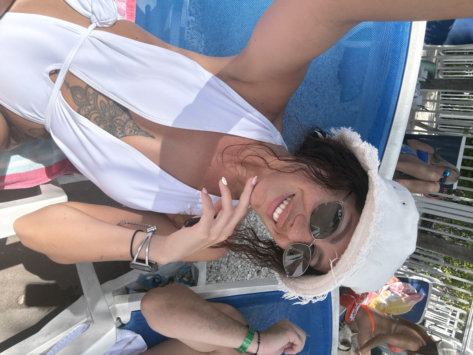 woman lying on a blue beach chair, likely in Key West, Florida. She's wearing a white swimsuit and a white frayed hat. She has sunglasses on and is smiling. She has a tattoo on her chest. She wears bracelets on both arms. The area appears to be a beach or poolside, with other lounge chairs and people visible in the background.