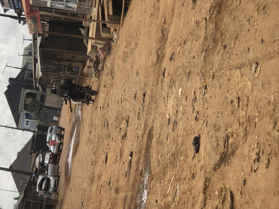 The image depicts an unpaved, reddish-brown dirt road in Egan, Nigeria, under an overcast sky