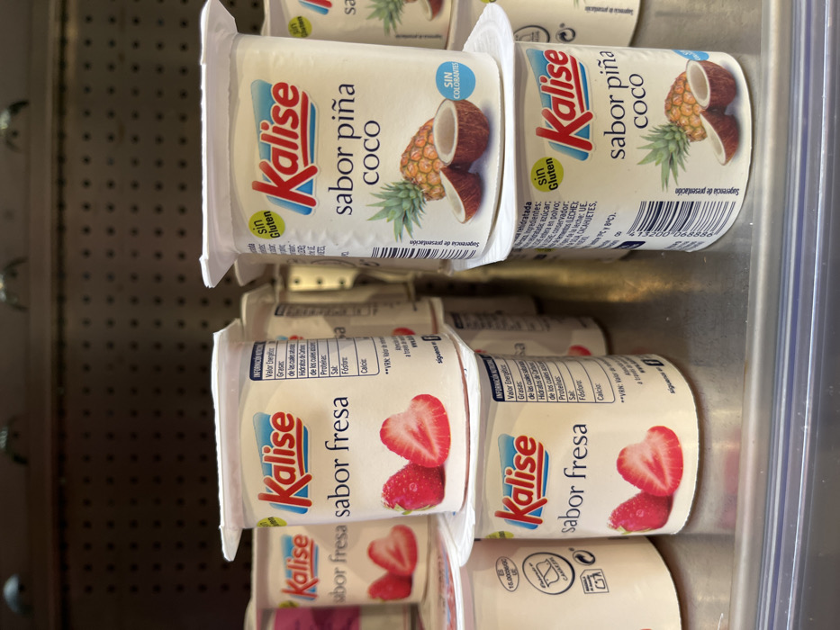 A refrigerated display case in a supermarket in Telde, Spain, located at 27.938 latitude, -15.389 longitude, contains several containers of yogurt. The yogurt containers are all white, with red and blue text and images. The top two containers are for "sabor piña coco" (pineapple coconut) yogurt, and the bottom two containers are for "sabor fresa" (strawberry) yogurt. The "sabor piña coco" yogurt is labeled "sin gluten" (gluten-free). The yogurt containers are arranged in two stacks, with the top row showing the labels and the bottom row showing the nutritional information. The environment is a well-lit grocery store. The contents of the yogurt containers are not visible.