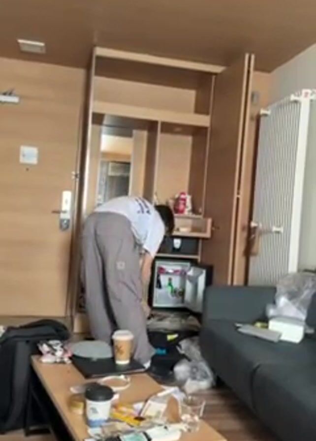 A person in a white t-shirt and gray pants is bending over a mini-fridge in a hotel room. The mini-fridge is built into a wooden cabinet. A coffee table in the foreground is cluttered with coffee cups, electronics, and other items. A gray sofa is visible to the right of the cabinet, and a suitcase is to the left. The room appears to be somewhat messy. The lighting is bright and even. The person is rummaging through the mini-fridge.