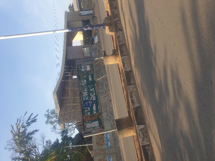 The image depicts an exterior scene under a clear blue sky with bright sunlight casting shadows across an asphalt road. In the foreground, an asphalt road runs diagonally, bordered on its left by a concrete curb painted white and black. Two concrete pedestals are positioned beyond the curb, supporting a large, weathered rectangular billboard. The billboard is dark green with partially legible white and light blue text, including "RUWA S...CA" and other smaller details. In the midground, behind the billboard, a building complex is under construction, appearing to be an entrance gate or a main facility. Its exterior walls are faced with rough-hewn stone. The roof structure is modern, possibly curved or multi-pitched, with a light-colored fascia. Scaffolding is visible within the open sections of the structure, indicating ongoing work. To the left of this structure, dense green foliage, including palm fronds, is visible, along with a utility pole and electrical wires. Large natural rock formations are partially obscured by the foliage. No people or vehicles are present in the frame. The discernible text on the billboard, "RUWA S...CA," is consistent with the acronym "RUWASSA" (Rural Water Supply and Sanitation Agency), pinpointing the location to the Plateau State Rural Water Supply and Sanitation Agency (RUWASSA) office at **No. 1 Miango Road, Jos, Plateau State, Nigeria**.