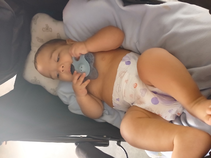 An infant is observed lying supine in a black stroller in Juan Griego, Venezuela. The infant has light skin and dark hair, and is shirtless, wearing a disposable diaper patterned with purple circles, orange clouds, and suns. Its head rests on a light-colored pillow with faint animal patterns. The infant holds a light blue, star-shaped teething toy in both hands and is actively mouthing it. A light blue blanket or liner is visible beneath the infant. The immediate environment is the dark interior of the stroller, partially shaded by its canopy.