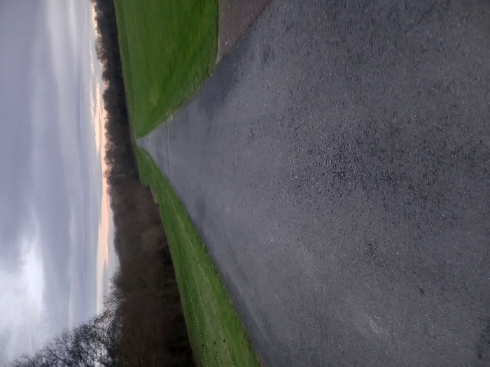 A perspective shot captures a gray asphalt road stretching into the distance. Green grass flanks the road on both sides, bordered by a line of trees and bushes on the left. The sky is overcast, with shades of gray and hints of faint orange near the horizon. The photograph has a muted, serene atmosphere.