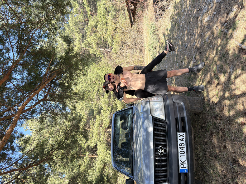 This image captures two individuals, one male and one female, in a wooded area near Kladnitsa, Bulgaria. A grey Toyota Land Cruiser SUV, bearing Bulgarian license plate PK 1048 AX, is parked on the left side of the frame, facing the viewer. The male, shirtless and wearing black athletic shorts, dark socks, and dark athletic shoes, stands in front of the vehicle, carrying the female piggyback. He wears orange-tinted sports sunglasses and has visible tattoos on his left arm and torso. The female, wearing a black long-sleeved top, black leggings, and dark athletic shoes with pink accents, is positioned on his back, facing the camera. She wears a dark baseball cap with a red detail and appears to be holding an orange object in her right hand over the male's shoulder. Both individuals are looking towards the camera. The background consists of a dense forest of coniferous trees under a clear sky. The ground is unpaved, covered with dry vegetation and pine needles. A rustic wooden structure is partially visible on the far right. Shadows are cast on the ground, indicating direct sunlight.