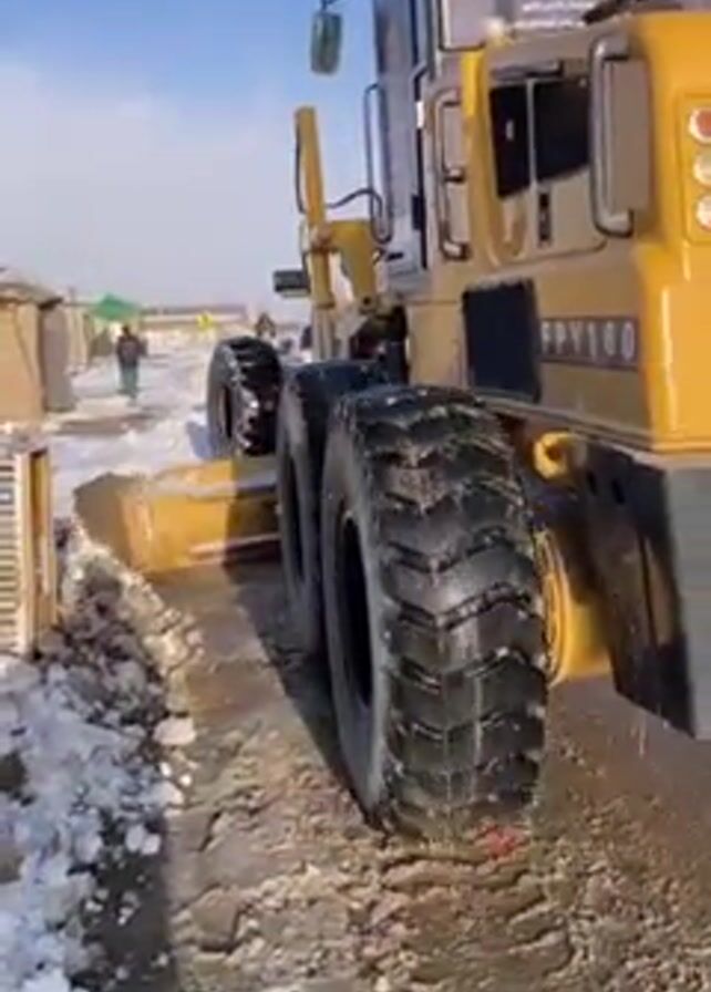 A yellow road grader is removing snow from the side of a road on a sunny day. The grader, identified as an FPY160 model, has large treaded tires and a snowplow blade extended to the side. A poster is affixed to the front of the vehicle. Snow is piled alongside the cleared road. In the background, a person can be seen walking near a small structure. The sky is blue, and the area appears to be somewhat rural or on the outskirts of a populated place. The grader leaves tire tracks in the snow and slush it has cleared.