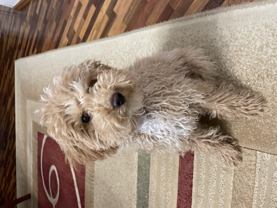 - "The image depicts a small, light-brown, curly-haired dog sitting on a patterned rug in an indoor residential setting in Aratashen, Armenia" by FM-4p9aD3, licensed under CC BY 4.0