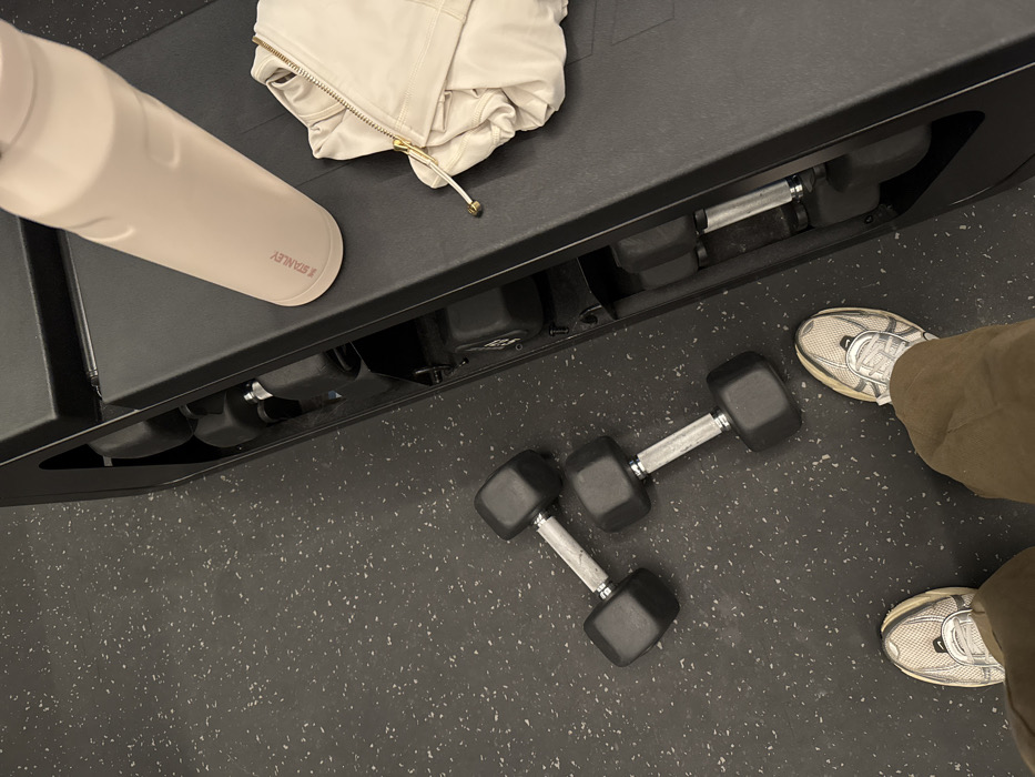 The scene depicts an interior view of a fitness facility in Dudley, United Kingdom, captured from an overhead, first-person perspective looking downwards. The floor is dark grey, speckled rubberized gym matting. In the foreground, the lower legs and feet of an individual are visible, wearing olive-brown trousers and light grey athletic shoes with white laces and accents. Two black hexagonal dumbbells with silver handles rest on the floor directly in front of the individual. To the right, a dark, multi-tiered dumbbell storage rack is present, partially filled with additional dumbbells on its lower shelves. The top surface of this rack holds a light pink Stanley brand water bottle lying horizontally and a folded, light-colored (off-white/cream) athletic jacket featuring a gold zipper pull and a matching drawstring. No individuals are depicted beyond the visible lower extremities.