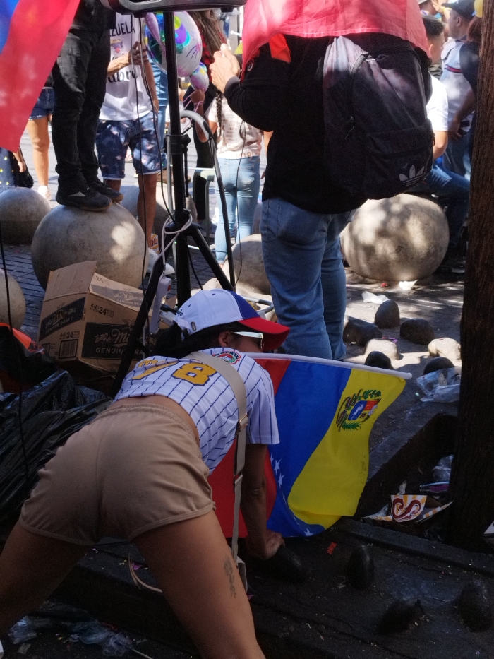 A woman in beige shorts and a striped jersey bends over, holding a Venezuelan flag. She wears a white cap with red and blue accents. The scene is an outdoor gathering with people standing around, some atop large stone spheres. A sound system tripod stands nearby. Debris is scattered on the ground. An Adidas backpack is visible on someone's back.